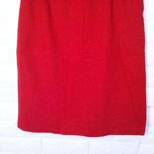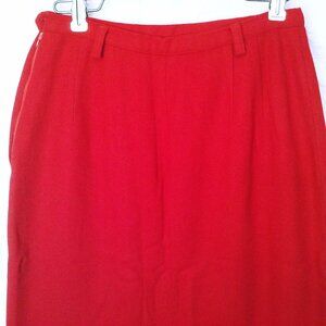 -- Unbranded USA Union-made tag cut, ladies - S(4), Knee-length Straight Pencil, tailored, back kick pleat, fitted waistband belt loops, side button Talon zipper closure, seam binding hem, solid midweight fabric, dry clean or hand washable wool material in bold bright red colorway. In pre-owned condition with no outwardly visible flaws and general wear to include: darning repair, couple fray spots, random dark dots - see pics for details.