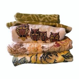 Vintage 70s Towel Set Owls Butterflies Pequot Martex Green Brown Yellow