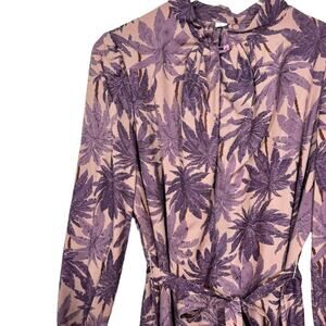 Vintage 70s Tropical Printed Midi Dress. Long sleeve pullover style with button closure at neck. Adjustable waist tie belt. Purple and beige tropical print design. High neck. Feels like Rayon.