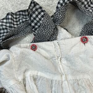 White maxi dress with an a line silhouette and attached matching cloth belt. Black and white checked ruffles down bust and at hem, with panels of black and white flower down the front as well. Back has button straps and a zip closure. No Stretch, and no pockets. Small yellow dot on bust, see last pic. No size, brand, or fabric content tags, but measurements indicate an extra small.