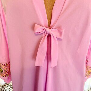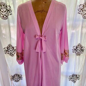 This vintage knee length robe by Vassarette is a lovely confection of pink nylon. Bow and button close the front. The full long sleeves have mod floral embroidery around them.