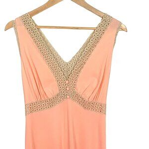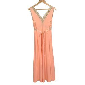 Vintage 70s Vanity Fair Peach Nightgown Maxi Lace Trim Size 36 Nylon Antron Tie Back