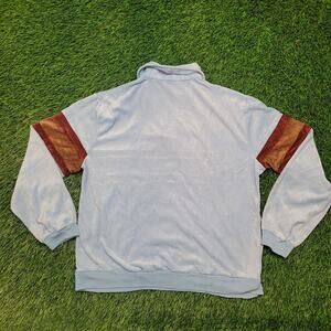 Vintage 70s Velour Chest Stripe Pullover Sweater Womens L/XL Disco Cropped Blouson Shirt Apres Ski Disco Plush Velvety Terry Cloth Style V-Neck Collard Hand Warmer Pockets Light Blue Powder Blue Brown Rust Caramel Colors Velour By Blocks Tag