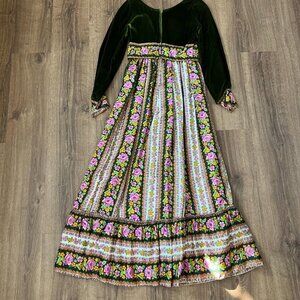 This is a true 70's vintage beauty that carries its style through today. From colors to texture, I was blown away by this one. Classic 70's green velvet long sleeve top paired with a silkier floral material bottom. Absolutely gorgeous colors. I believe this was handmade but if so, it was done by a serious seamstress. bottom half is lined and full zip up the back. Floral cuffs, matching velvet buttons and ribbon trim. This is truly stunning in person.