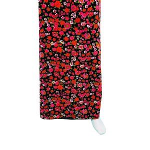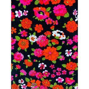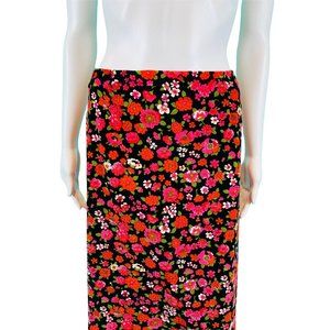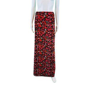 A vintage 1970s velvet maxi skirt with a black background and a red/pink/green/white floral print. Zips up the back.