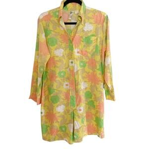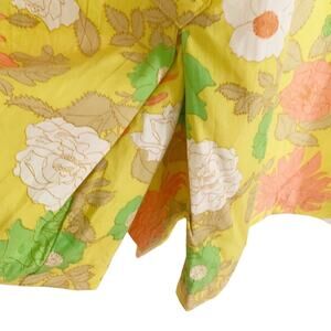 Yellow, orange, green and white make up this vintage 70's floral shorts romper. Button front. Button down collar and button cuffs. Long sleeves. One chest patch pocket. 50% poly/50% rayon. Marked size 13/14. Excellent condition.