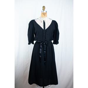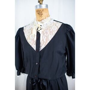 1970s gothic/Victorian style midi dress, featuring a black body with a lace front panel and a high neckline. It has puffed sleeves and an elastic waist with a black ribbon tie, falling to a flowy skirt. This dress is in very good vintage condition and has been freshly laundered, making it perfect for autumn/Halloween! By 'Sears Bazaar'
