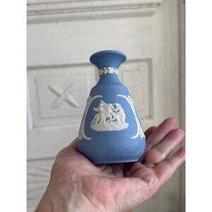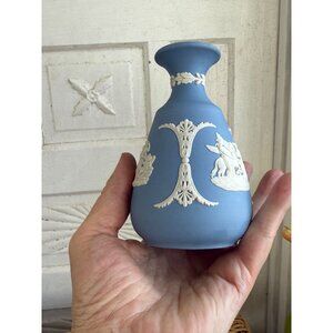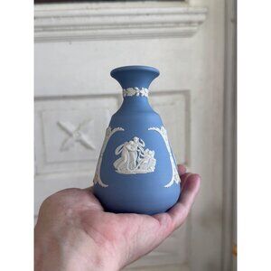 This Wedgwood blue jasperware vase showcases exquisite neoclassical designs. Its timeless elegance and detailed craftsmanship make it a distinguished collectible from the 1970s. Displaying this vase adds a classic touch to any room, reflecting an era of artistic finesse from England's renowned Wedgwood pottery. This measures about 5" tall. There are no chips or cracks and this is in great condition.