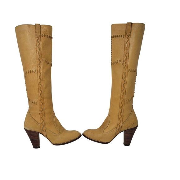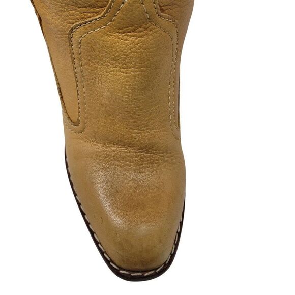 Vintage 70s Western Tan Knee-High Leather Boots Sz 3 Patchwork Stitching Heeled
