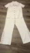 Adorable two piece vintage polyester lounge set in white with colorful embroidered panels on the chest and pant legs. Short sleeve top with pointed collar and contrast blue buttons. Pants have an elastic waist with great stretch but the elastic will need to be replaced or re-sewn in a few spots. Top blue button is missing. Overall awesome vintage condition with light signs of age.