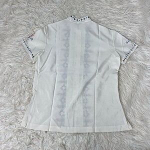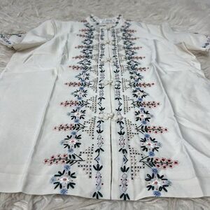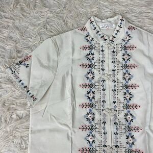 Vintage 70s White Floral Hand Embroidered Silk Ladies Blouse Button Front Small