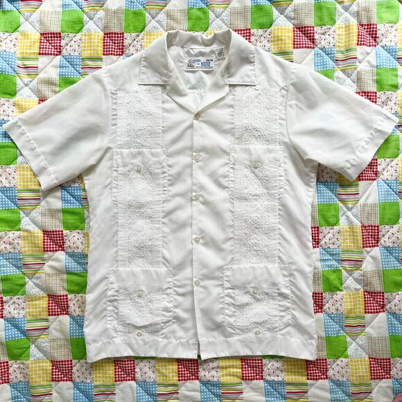 Vintage 70s White Guayabera Shirt Short Sleeve Mexican // Size Medium