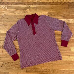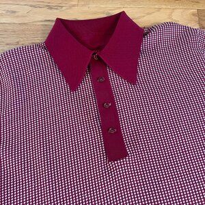 This is a super cool Vintage 70s Wide Collar Maroon-White Grid Patterned Disco Long-Sleeved Polo Shirt in a size Men's Medium/Large. No tags left but fits as a Medium/Large. Definitely 100% Acrylic.