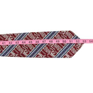 Step back into the bold fashion of the 1970s–80s with this duo of statement wide ties. The brown tie features a striking ancient warrior motif with blue stripe accents, while the red tie showcases an intricate geometric jacquard in burgundy, cream, and blue. Both measure approx. 4" at the widest point, ideal for vintage collectors, retro stylists, or costume wardrobes.