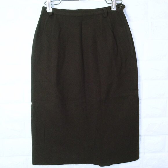 -- Unbranded no labels no tags made in USA, ladies -XS(0/2), Knee-length Pencil unlined, tailored flat-front, back kick pleat, fitted waistband belt-loops, seam binding hem, side button metal Falcon zipper closures, solid midweight textured tweed fabric, dry clean hand washable wool material in dark neutral brown colorway. In excellent pre-owned condition with no visible flaws - see pics for details.