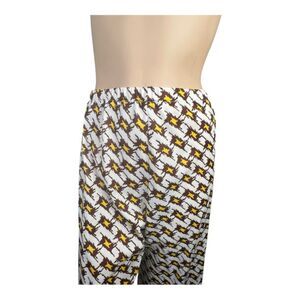 Unique vintage women’s matching two-piece set featuring a bold brown, yellow, and white geometric print. Includes a long-sleeve button-up blouse with a collar and wide-leg elastic waist pants. Perfect for a retro-inspired look or statement outfit.