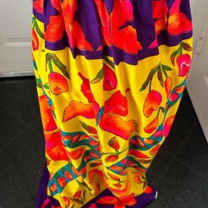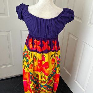 Colors: Deep purple bodice; orange, yellow, green butterfly and floral print on skirt