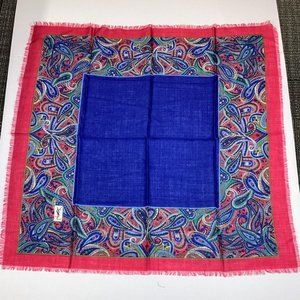 Vintage 1970s Yves Saint Laurent YSL multicolor wool fringed scarf. Made in Italy. RN43756. Featuring black polka dots on blue ground at center, a multicolor paisley Indian buta border, a red outer border, and fringe hem around entire square scarf. 100% wool. In new pristine vintage condition.