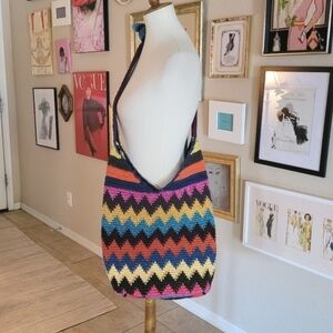 Excellent pre owned condition. Vintage 70's Zig Zag Multi-color Woven Crossbody Hobo Bag. Top knot strap