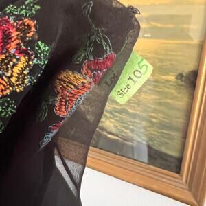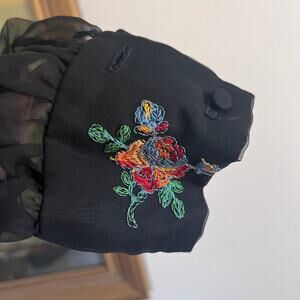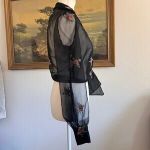 Vintage 70s black sheer crop top blouse floral embroidered boho whimsigoth Small
