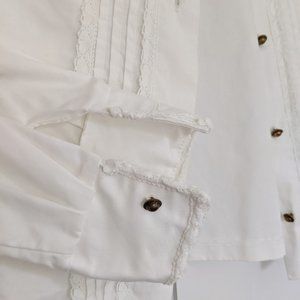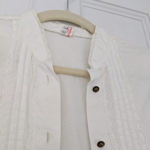 70s military blouse with delicate lace detailing, brass buttons, structured cuff sleeves