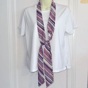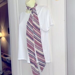 Vintage 70s cream, pink, maroon, turquoise green & gray diagonal striped thin polyester long skinny scarf