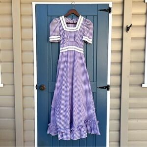 Charming purple gingham maxi dress featuring a ruffle hem and lace trim. Perfect for a vintage-inspired look.