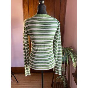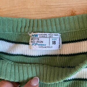 Vintage striped ribbed knit in soft sage, white, and deep green. Slim, fitted body, crew neckline, long sleeves. Tagged JCPenney Boys 18, made in Korea. Best for a modern women’s XS–S or teen fit. Shown on a woman's XS person.