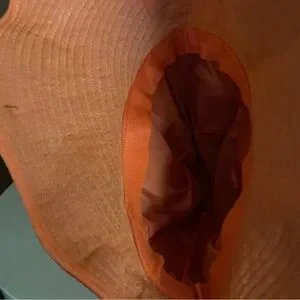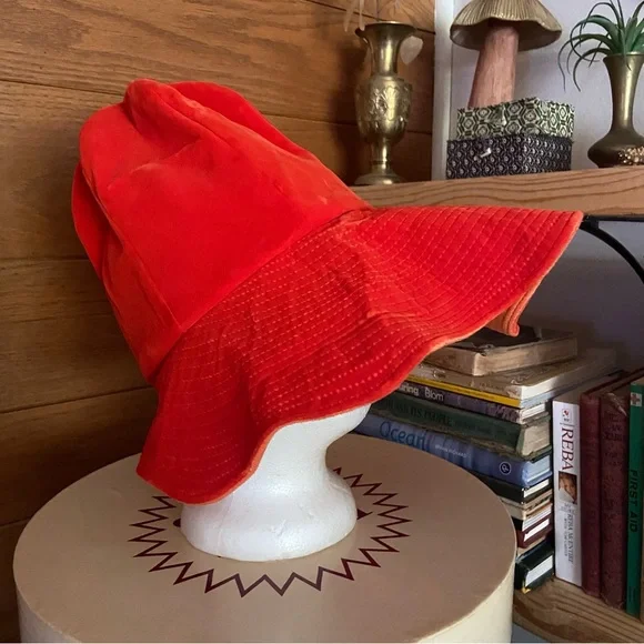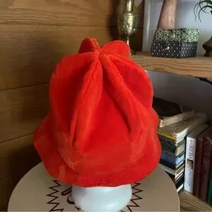 Vintage 70s mod orange flocked velvet wide brim bonnet hat. Super high crown with pleated detail at the top. Approximately 23 inch circumference head opening. No brand tags. Great used condition.