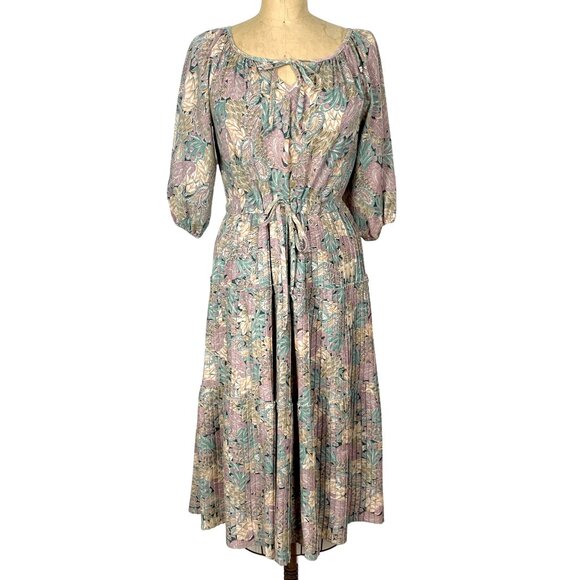 1970s floral peasant dress. Features a romantic keyhole neckline with tie, drawstring waist for adjustable fit, and floaty 3/4 raglan sleeves with elastic. The multi-tiered midi skirt has fine pleats that add movement. Perfect for fans of prairie, boho, cottagecore, or romantic vintage style.