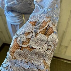 Vintage lace and chiffon vintage gown with rhinestone detailing. Sizing tag says size 10 but in my opinion dress runs smaller. Length 56” Pit to pit measurements 18” Waist 28” Sleeves 24”
