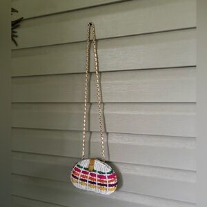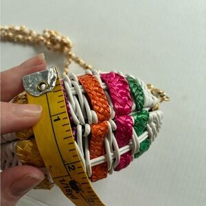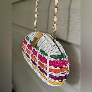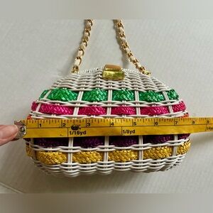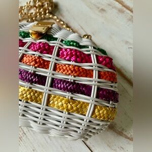 I adore this 1970s picnic basket style purse with its oblong/ oval shape and woven plastic coated wicker.
