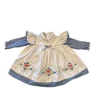 Adorable 70s baby dress featuring floral embroidery and blue gingham sleeves. Perfect for special occasions.
