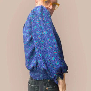 Vintage 70’s silky three flaggs California saturn novelty pattern blue top-L