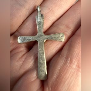 The cross has a raised bead design on each of the cross arms with a turquoise stone in the intersection middle point.