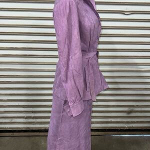 Vintage 70’s skinner ultra suede skirt and button blouse purple size 12 w/belt the clasp in the back is loose and needs to be tightened up and one thread belt loop is not attached. Other than those two things this piece is in excellent condition no rips no tears no thin spots