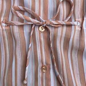 Vintage 1970s white and light orange striped button up blouse with short puff sleeves and cinched tie waist. Preppy, light academia, retro. Has mini shoulder pads. Patty Woodard California. Size 7 / 8. Pit to pit 17.5". Total length from shoulder to hem is 22". Excellent condition pre owned, just has a few small discolorations in various spots.