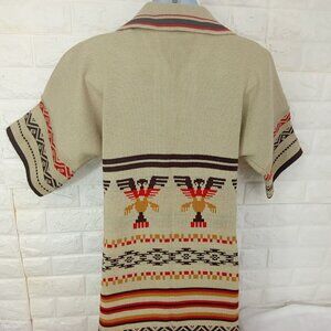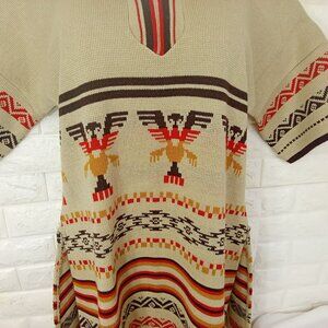-- Unbranded Unmarked, Aztec Southwestern, women's -Medium/Large (10/12), Pullover Polo-neck collar, Drop-shoulder short sleeves, hemline fringe, 12" side slits, easy care washable unknown acrylic blend, bold bright stripes eagle motif pattern in beige red brown gold colorway.