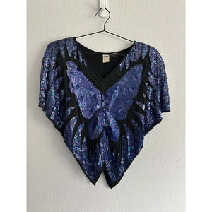 Vintage 70s/80s BUTTERFLY Bluish purple sequin and beaded cape blouse top Sz M