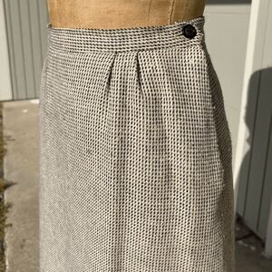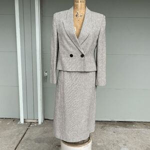 Elevate your wardrobe with this timeless vintage 1980s Bert Newman tweed skirt suit set, crafted in the USA. The set includes a double-breasted cropped blazer and a matching pencil skirt, both in a classic black and beige houndstooth pattern. The blazer features a tailored silhouette with sharp lapels, two front buttons, and fully lined construction for comfort. The high-waisted pencil skirt is tailored with pleats at the waistband, side pockets, a side button closure, and a back slit for ease of movement. The neutral tones and structured design make this ensemble perfect for professional settings or vintage-inspired styling.