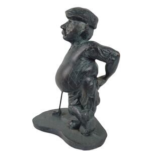 This vintage 1970s-80s era funny resin statue features a big-bellied golfer guy scratching his bottom. It measures 8-1/4" tall with a 6" x 4-1/4" base. Made of a resin material and finished in a black-blue color. Unmarked as to the maker or origin.
