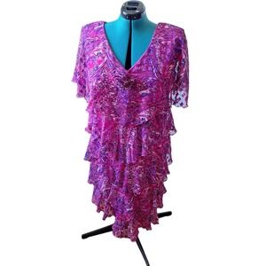 Vintage 70s/80s Hot Pink/Purple Swirl Ruffled Flutter Sleeve Dress Women Size L