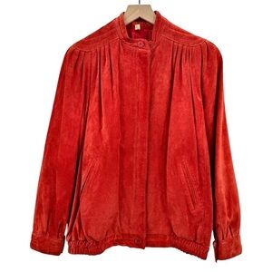 Women's vintage 70s/80s orange suede leather bomber jacket. Made in Taiwan. Full zip, tab collar, elastic waist, welt pockets.