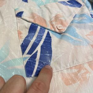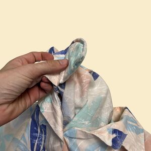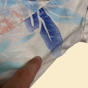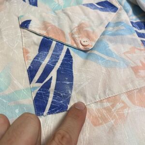 Vintage womens half sleeve abstract button down blouse, manufactured ca. 1970s-1980s by KBJ Wear California. Tropical geometric leaf patterned light pink and blue top with shoulder pads, a front pocket, and a collar. Size 42.