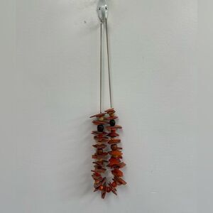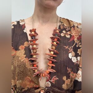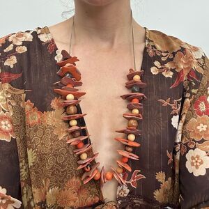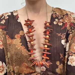 Vintage 70’s Beaded Wooden & Chain Statement Necklace Orange & Brown 30"