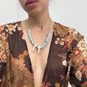 Vintage 70’s Blue Bead & Shell Tooth Necklace Silver Tone Chain 20"