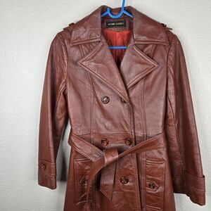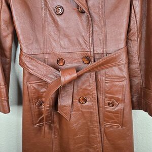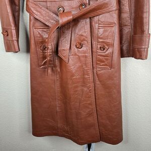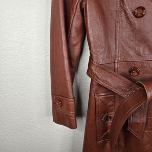 Vintage 70s Brown Double-Breasted Leather Trench Swing Coat Belted Womens S Mod