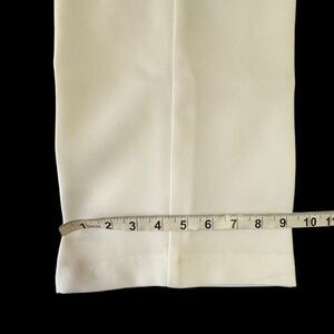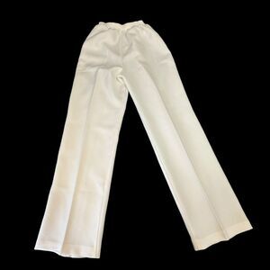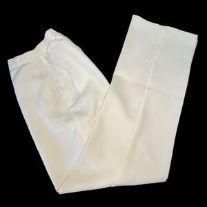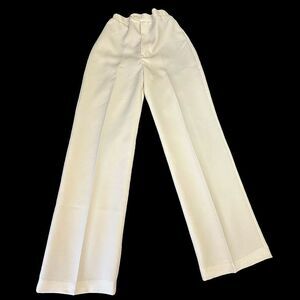Vintage 1970’s Crisp White High waist Wide leg Trousers Pants Size 4 with partially stretch waist. Neatly Permanent creased Flat front, zip and clip fastening with elastic waist at back for comfort and stretch all day. So easy care hardly even need a press when washed . Super white you’d think they were new today. In excellent condition. Union made in USA. Size tag says 12 but hip and waist measurements suggest a 4, please consider stretch in waist.