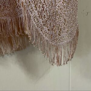 This vintage dress is in mint condition! The crocheted dress has a cool Art Deco pattern and between the scalloping has threads that are more like sheer panels. The yarn is a light pink with metallic threads woven through. The bottom of the dress and jacket both have fringe on the bottom. The jacket has shoulder pads. This dress Boho chic meets Art Deco flapper!