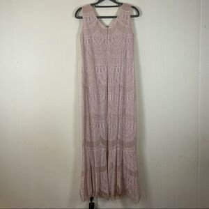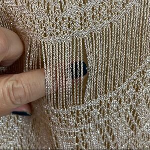 This vintage dress is in mint condition! The crocheted dress has a cool Art Deco pattern and between the scalloping has threads that are more like sheer panels. The yarn is a light pink with metallic threads woven through. The bottom of the dress and jacket both have fringe on the bottom. The jacket has shoulder pads. This dress Boho chic meets Art Deco flapper!